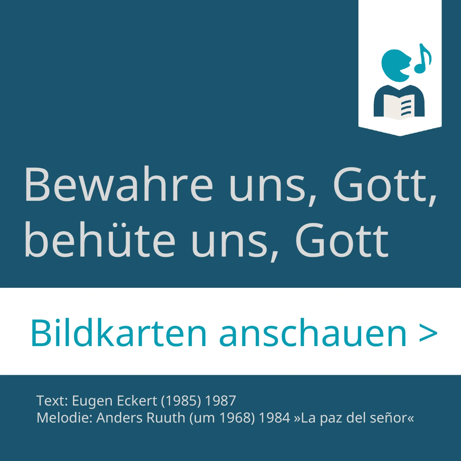 Wie in einem Bilderbuch führen die Bildkarten Schritt für Schritt durch das Lied. Beim gemeinsamen Singen können Eltern und Kinder so Strophe für Strophe entdecken und das Lied gleichsam „singend durchblättern“. Die Zeichnung ist bewusst schlicht und kindgerecht gehalten. Ihre offene Gestaltung lädt dazu ein, eigene Assoziationen einzubringen, die Motive weiterzudenken und die Bilder vielleicht sogar selbst kreativ zu ergänzen oder eigene Bilder zu gestalten.