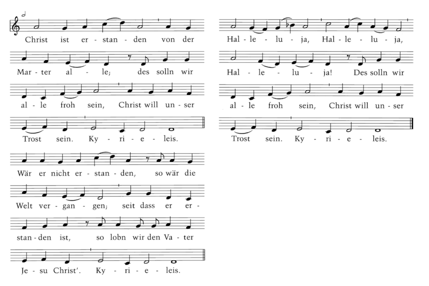 Die Melodie verwendet nur sechs Töne. Sie strahlt eine große Feierlichkeit und Würde aus. Der Grundton d wird zweimal unterschritten. Das h, das zu einer dorischen Melodie gehören würde, wird ausgespart. Die 1. Zeile beginnt erhaben auf der 5. Stufe und führt gleich zum höchsten Ton der Melodie. Das Wort „erstanden“ wird dabei durch eine Ligatur zusätzlich hervorgehoben. Die zweite und die vierte Zeile sind melodisch identisch. Sie führen jeweils abwärts zum Grundton. Die 3. Zeile zeichnet sich durch drei Quartsprünge (auf, ab, auf) aus, welche das „froh sein“ unterstreichen. Die dritte Strophe erweitert die Melodie mit dem dreifachen Halleluja zu einem sechszeiligen Lied. Mit dem b beim 1. Halleluja wird kurz ein helles F-Dur andeutet. Das rhythmisch vorgezogene Kyrie nimmt die frohe Stimmung auf und bringt sie zur Ruhe.
