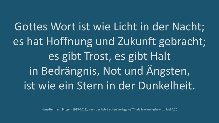 Der ursprüngliche Text des Kanons ist der Hebräischen Bibel entnommen (Joel 4,20 EU). Hebräisch: ודור לדור וירושלם תשב לעולם ויהודה, ṾiYhuda le‘olam teshev, ṿiYrushalayim ledor ṿador / deutsch: „Juda aber wird für immer bewohnt sein und Jerusalem von Geschlecht zu Geschlecht.“ Inspirierend für den deutschen Text war neben der Musik Joseph Jacobsens auch eine Verheißung aus dem Alten Testament, die dem Verfasser beim Anblick des Sternenhimmels in Israel in den Sinn kam. Dort spricht Gott zu Abraham: „Sieh doch zum Himmel hinauf und zähl die Sterne, wenn du sie zählen kannst. So zahlreich werden deine Nachkommen sein.“ (Gen 15,5) Dieses Wort Gottes brachte Licht in Abrahams Leben. Es schenkte ihm Vertrauen, Trost und Halt in seiner Dunkelheit.