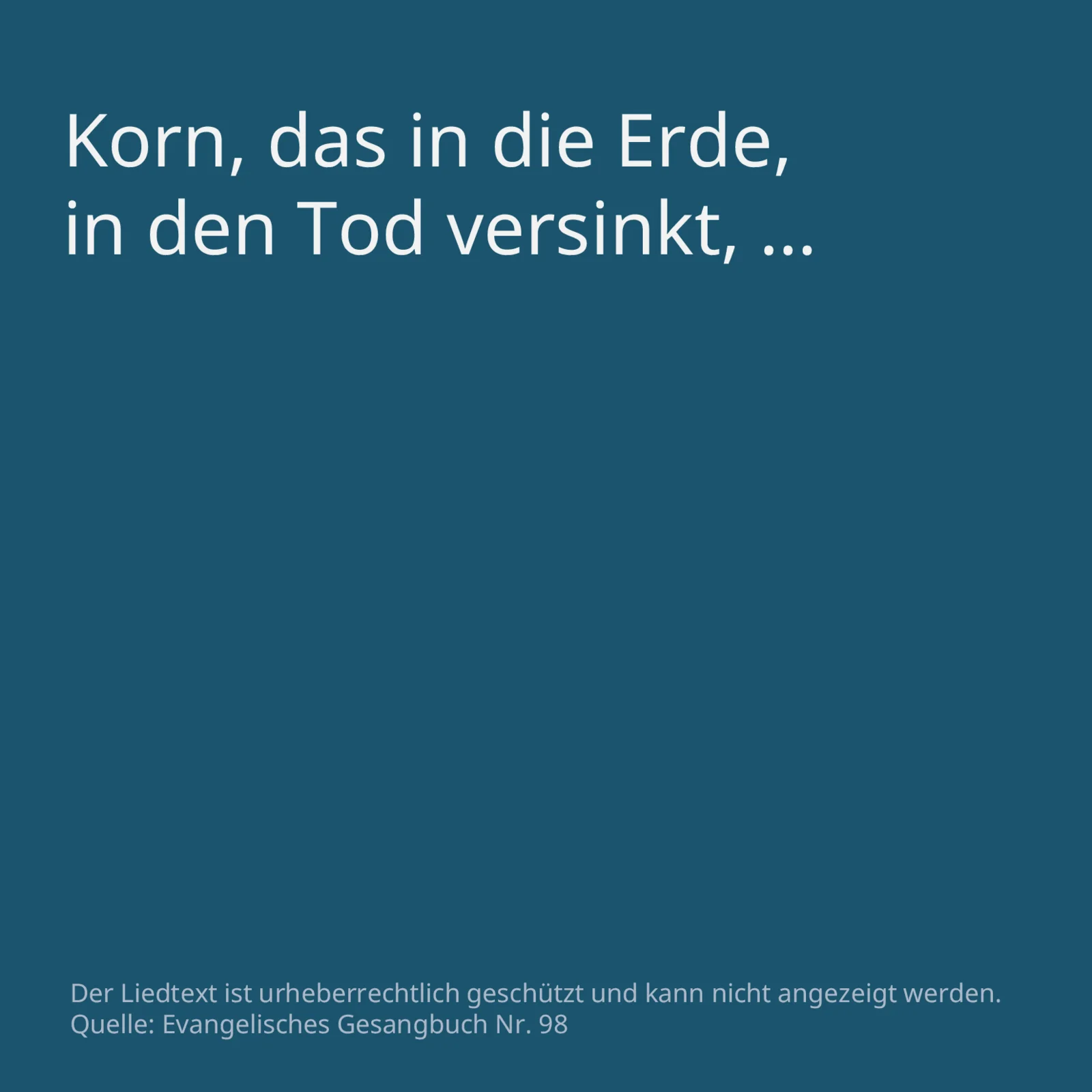Wie die vierstrophige englische Vorlage meditiert das Lied das Jesuswort Joh 12,24: „Wenn das Weizenkorn nicht in die Erde fällt und erstirbt, bleibt es allein; wenn es aber erstirbt, bringt es viel Frucht.“ Daher wird die geheimnisvolle Verbindung von manifestem Tod und erhofftem Leben, von Passion und Ostern, bedacht. Das in die Erde, in den Tod versinkende Korn wandelt sich unerklärlich in den Keim der Liebe, der im Morgen aufgeht: „Liebe lebt auf, die längst erstorben schien“ (Strophe 1). Mit der Hinrichtung und dem Begräbnis Jesu hat „die Welt“ die in ihm erschienene Liebe Gottes endgültig ausgeschlagen (Strophe 2). Auch bei uns geht seine Saat nicht auf, sondern – in einer kurzen Einblendung des Gleichnisses vom vierfachen Acker – verliert sich ins Vergebliche. Doch: „Hin ging die Nacht, der dritte Tag erschien“ (Strophe 3). Jede Strophe mündet in den kleinen Refrain: „Liebe wächst wie Weizen, und ihr Halm ist grün.“