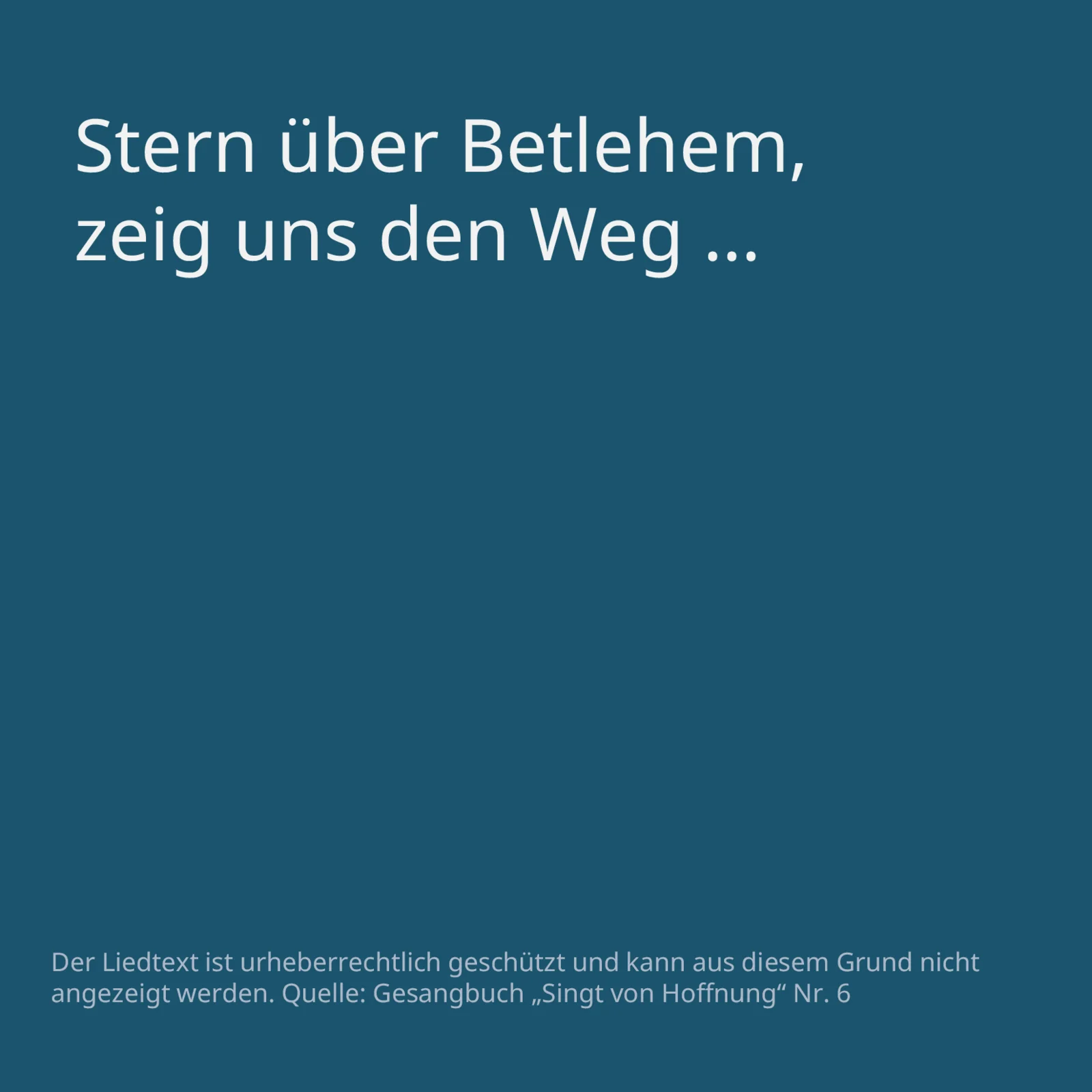 Der biblische Bezug besteht zu Matthäus 2,1–11. Die Worte „Stern über Bethlehem“ finden sich in jeder Strophe. „Dieser Stern ist der Motor für das Gehen wie für das Verweilen und anschlussfähig für viele Geschichten, Überlegungen und (Welt-)Anschauungen zu Sternen überhaupt“ (Junkermann/Schroeter-Wittke). Das Strophenlied umfasst vier Strophen mit jeweils vier Zeilen zu je zehn Silben auf einem daktylischen Versfuß (betont – unbetont – unbetont) und folgt dem einfachen Reimschema aabb.