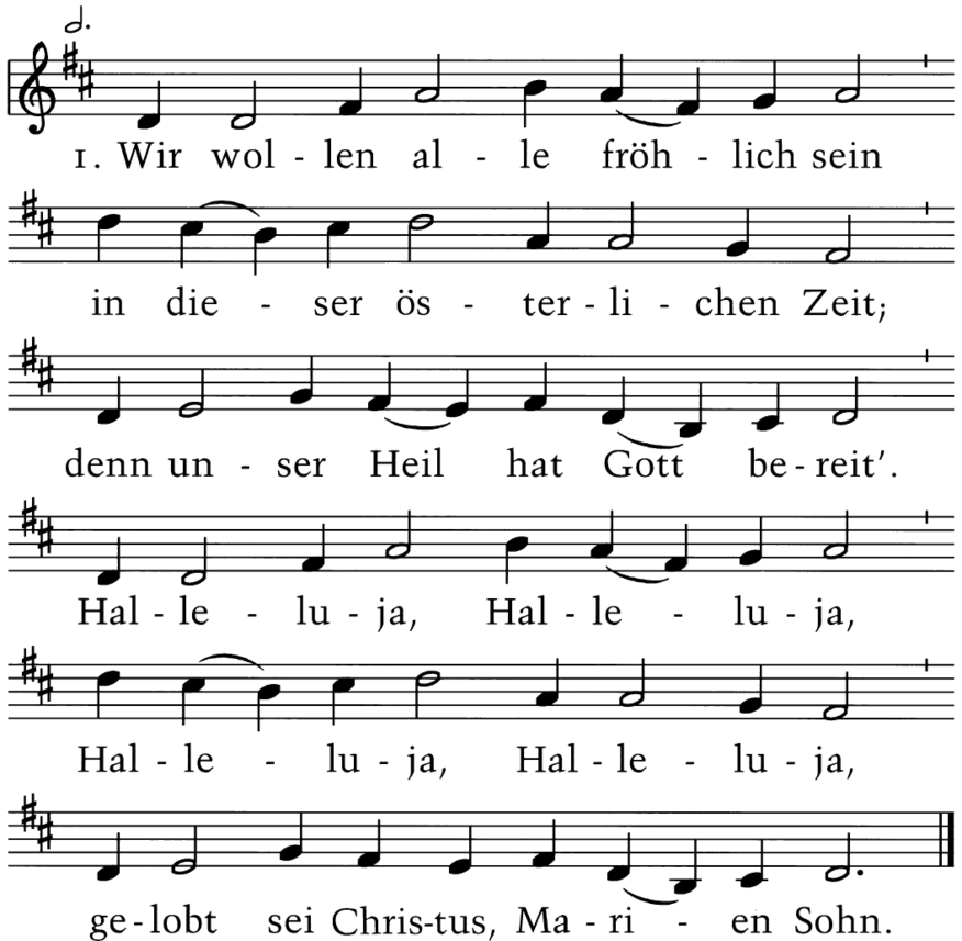 Die Melodie schwingt sich vom Grundton aus aufwärts und erreicht bereits zu Beginn der zweiten Zeile ihren Höhepunkt. Die dritte Zeile beginnt und endet auf dem Grundton, wobei dieser am Schluss von unten her erreicht wird. Der Dreiertakt gilt in der älteren Musik als Zeichen der Vollkommenheit; so verweisen auch der dreizeilige Aufbau des Textes und die in der letzten Strophe benannte Dreieinigkeit nicht nur auf Fröhlichkeit, sondern auf vollkommene Freude. Charakteristisch ist die Wiederholung der Melodie im Kehrvers. Gegenüber den Strophen wird lediglich eine Ligatur aufgelöst, um die neun Silben der letzten Zeile in die Melodie einzupassen. So konzentriert der Text ist, so sparsam ist auch die musikalische Gestaltung: Mit den drei Zeilen der Melodie ist alles gesagt – ein freudiger Gesang, der gleichsam in die Ewigkeit weist.