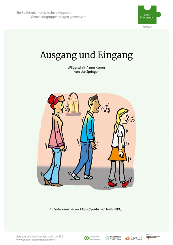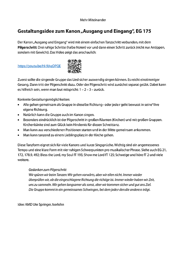 In der Vermittlungsidee von Ute Springer aus „Ein Buffet mit musikalischen Häppchen“ wird die Bewegung des „Pilgerschritts“ vorgeschlagen, um das Singen körperlich erfahrbar zu machen und die innere Haltung des Unterwegsseins auszudrücken. Die Singenden gehen dabei langsam im Rhythmus des Kanons vorwärts. So entsteht ein ruhiges, schreitendes Gehen, das den meditativen Charakter des Liedes unterstreicht. Der Kanon „Ausgang und Eingang“ kann dabei verschiedene „liturgische Wege“ für Große und Kleine im Gottesdienstraum sichtbar machen.