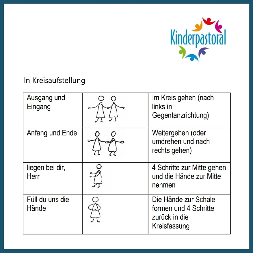 Quelle: aus „Bewegungen zu Liedern und Gebeten aus dem Gotteslob“ Gesammelt und illustriert von Monika Mehringer, Fachbereich Kinderpastoral, Erzbistum München und Freising, Stand Juli 2016
