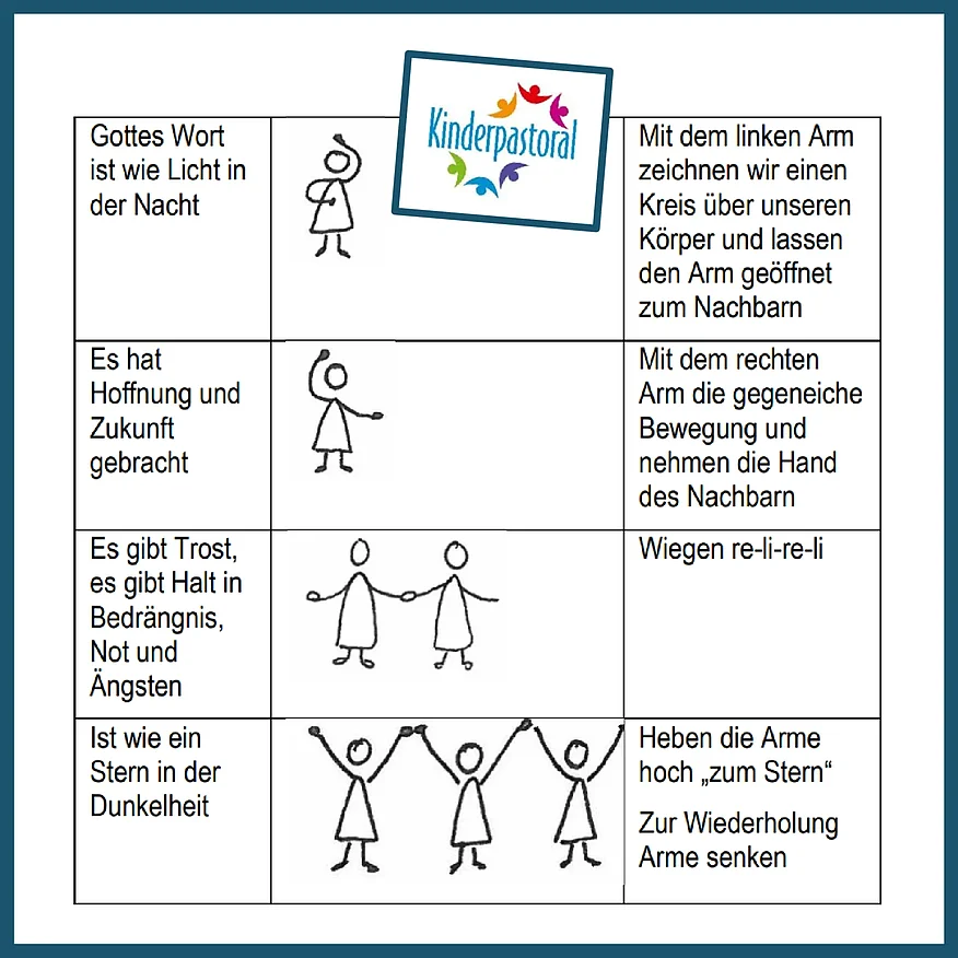 Die Tanz- bzw. Bewegungsidee von Monika Mehringer ist schlicht und kann bereits von den Allerkleinsten mitvollzogen werden. Da sich das Lied auch besonders für die Advents- und die Fastenzeit eignet, ist es schön, dass am Ende des Tanzes ein Stern sichtbar wird, wenn sich eine Gruppe von Kindern oder Erwachsenen im Kreis aufstellt. Die Bewegungen lassen sich jedoch auch in der Kirchenbank ausführen.