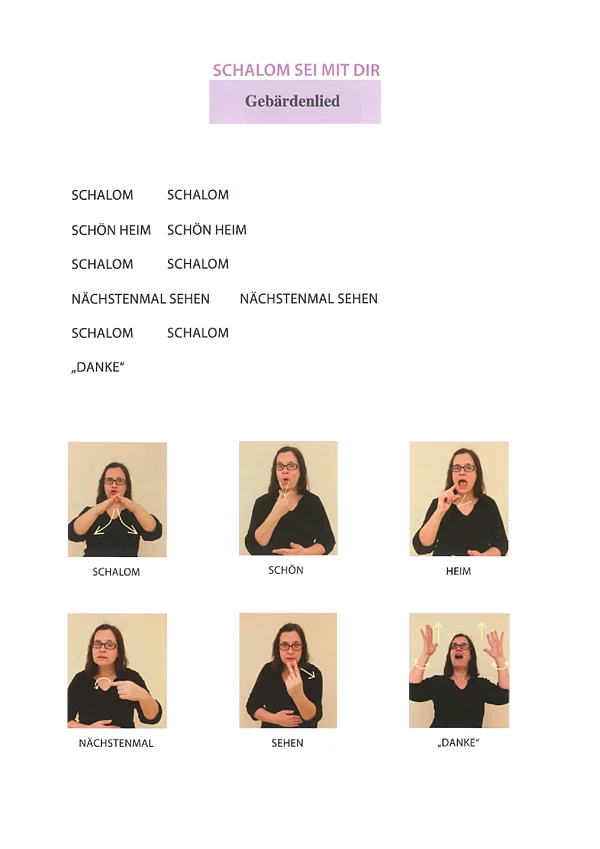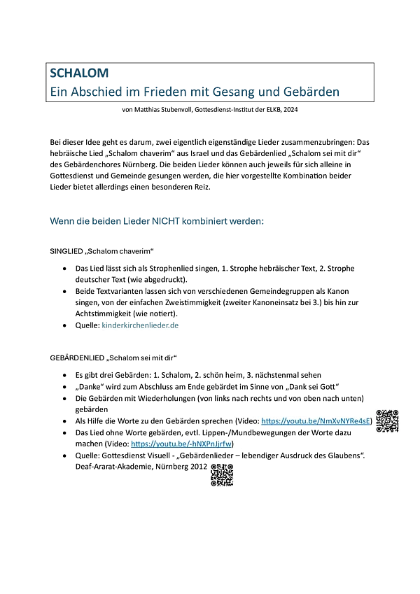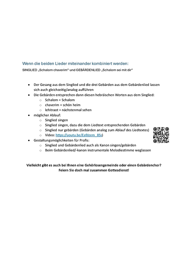 Bei dieser Idee geht es darum, zwei eigentlich eigenständige Lieder zusammenzubringen: Das hebräische Lied „Schalom chaverim“ aus Israel und das Gebärdenlied „Schalom sei mit dir“ des Gebärdenchores Nürnberg. Die beiden Lieder können auch jeweils für sich alleine in Gottesdienst und Gemeinde gesungen werden, die hier vorgestellte Kombination beider Lieder bietet allerdings einen besonderen Reiz.